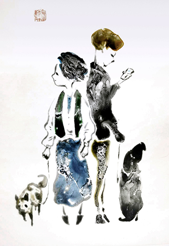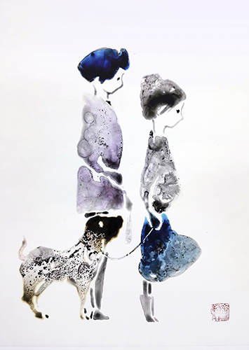 The majority of the vinyl paintings in this exhibition is selected from Chang‘s “Dog Walker” series that began in 2024. According to the artist, “In the city I live in, in my neighbourhood and in the apartment I live in, I often see dogs and dog lovers and families, and they are everywhere.” Chang has curiously observed in this ubiquitous demographic the emotional interactions between humans and canines. Whether the dog owners are casual joggers or chic fashionistas, the artist has tried to convey in these vinyl ink paintings this seemingly natural affinity that people have towards their beloved dogs.